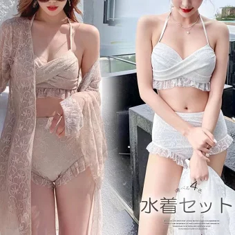 フェミニンな3点セット 選べる4色 水着 フリルビキニ レースパレオ フレア ハイウエスト クロス タンキニ 体型カバー スイムウェア スカパン 夏 海 ビーチ セクシー