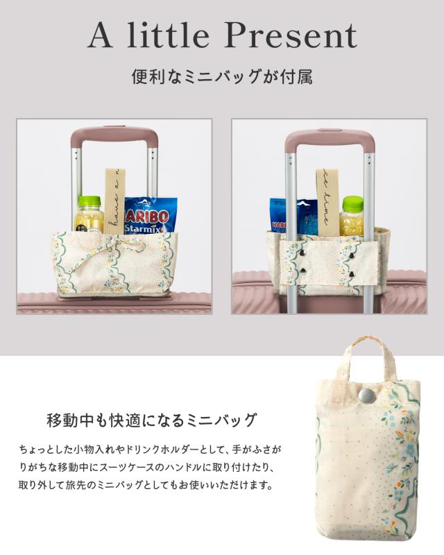 | 現代の旅スタイルに寄り添った機能と、男女問わず使いやすい本体カラー&内装デザインをプラスしたスーツケースシリーズ、「ココント」。デザインと機能のひとつひとつに旅がもっと素敵に、もっと快適になるアイデアが詰まっています。 両面収納できる2部屋仕様のスタンダードタイプ。 58Lタイプは3〜5泊程度の旅行や出張におすすめなサイズです。 ●両面/2部屋タイプ 両面に収納できる2部屋タイプの内装仕様。 収納スペースが分かれて、荷物やお土産が仕分けしやすいので家族とのシェア持ちにも使いやすい! ●内装ポケット 中身が見えるメッシュポケットや、小物の収納に便利なマチありのポケットを配置。 ●中仕切り 可愛いロゴ刺繍入りの中仕切りが付いているので、空港やホテルなどで開けても中身が見えず安心です。 ●キャスターストッパー 電車での移動などで、手を離しても転がらない便利なキャスターストッパー付き。 手元にボタンを配置しているので、かがまずにワンタッチで操作が可能です。 ●ミニバッグ 便利なミニバッグが付属。 ちょっとした小物入れやドリンクホルダーとして、手がふさがりがちな移動中にスーツケースのハンドルに取り付けたり、取り外して旅先のミニバッグとしてもお使いいただけます。 ●旋回性に優れ容易に方向転換可能な双輪キャスター ●身長や持ち方に合わせて4階調整が可能なプルドライブハンドル ●カギの持ち歩きが不要な3桁のダイヤル式TSロック ●デザイン&カラー ボディデザインにはHaNTらしい「なみなみななめリブ」を採用。 お洒落なニュアンスカラーのボディとハンドルのバイカラーデザインにシルバーのメタルパーツがアクセントです。 表面は傷が目立ちにくいマットな質感です。 内装柄は本体カラーごとに異なるデザインの強撥水加工を施したプリント生地を使用。 |