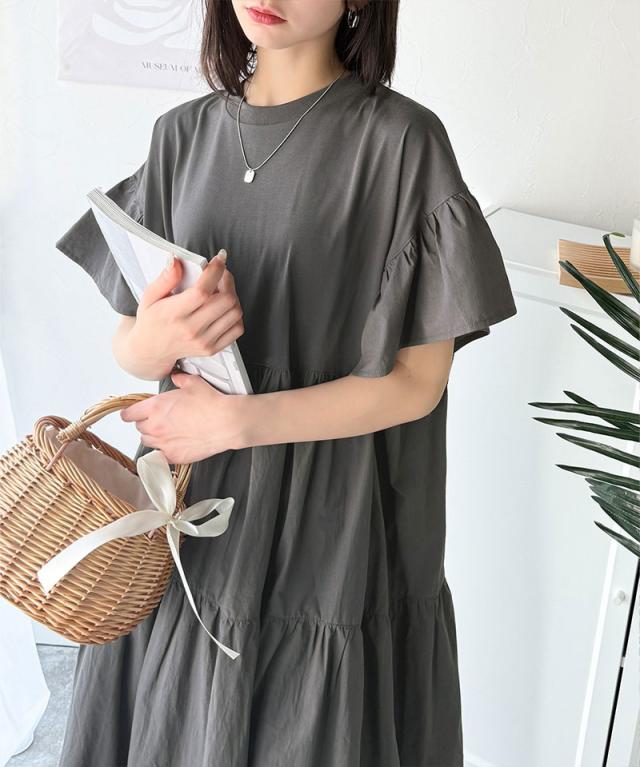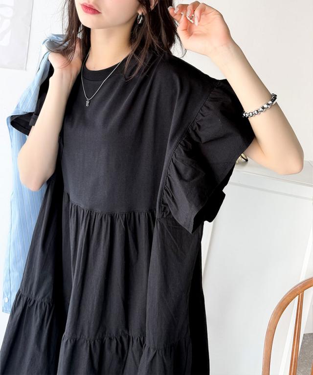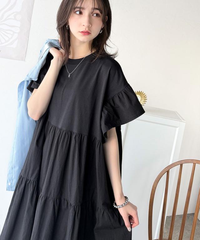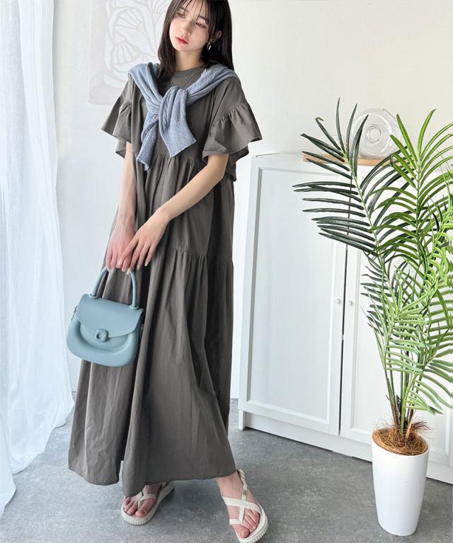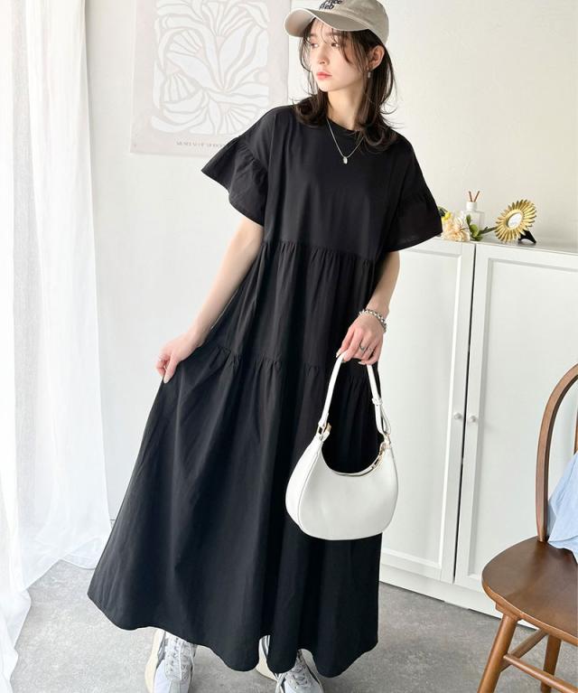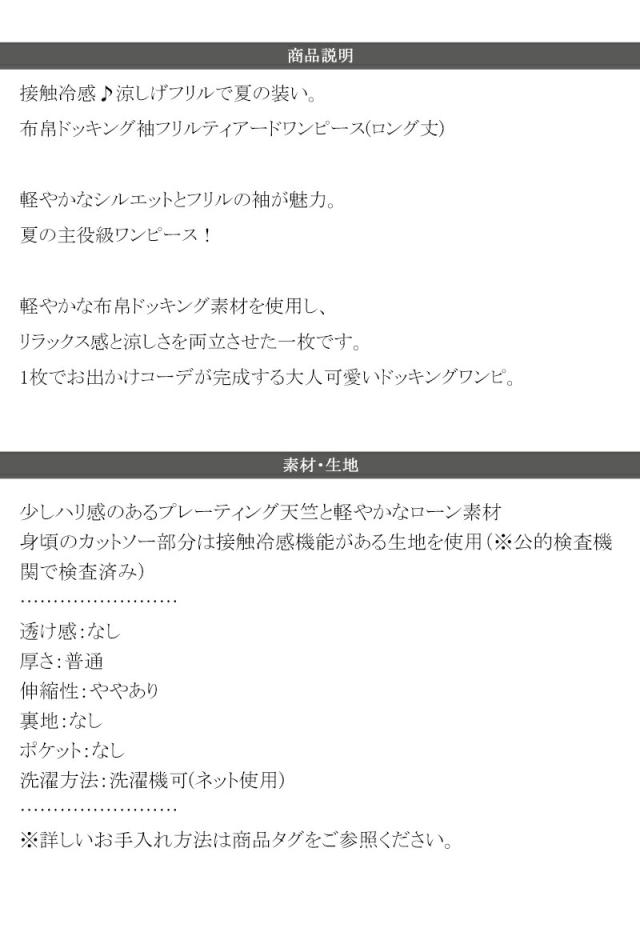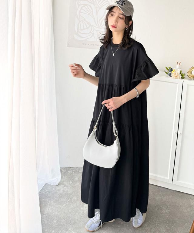 ★接触冷感♪涼しげフリルで夏の装い。布帛ドッキング袖フリルティアードワンピース(ロング丈)★