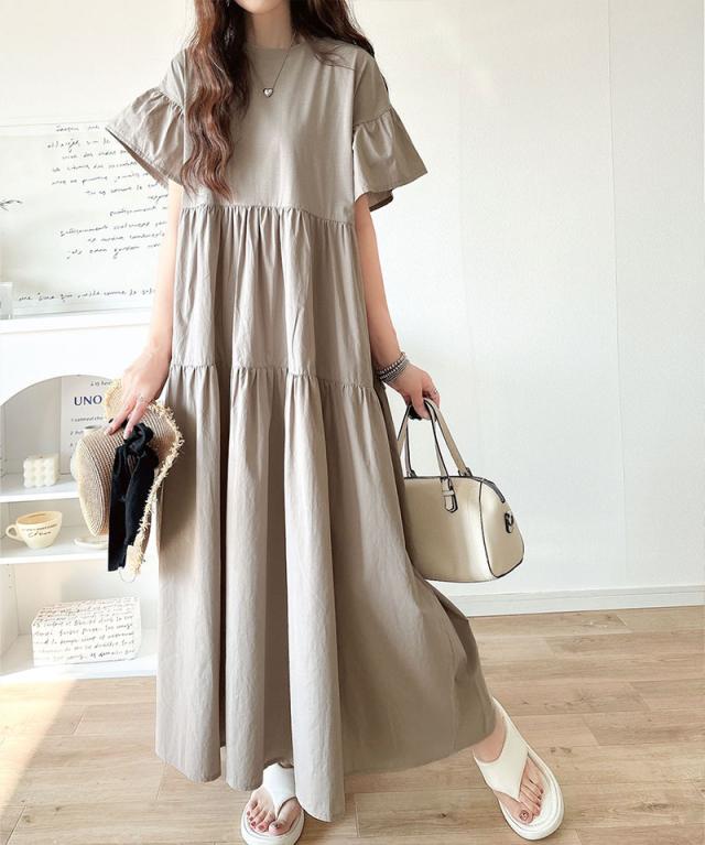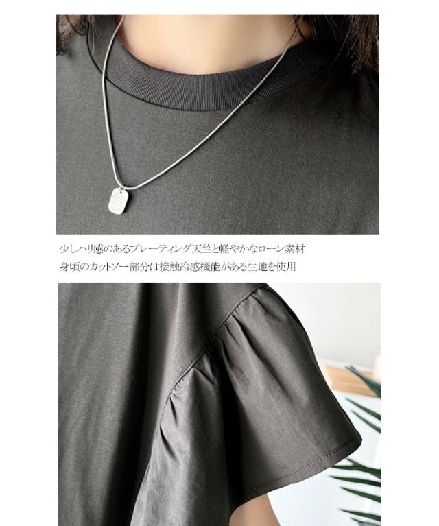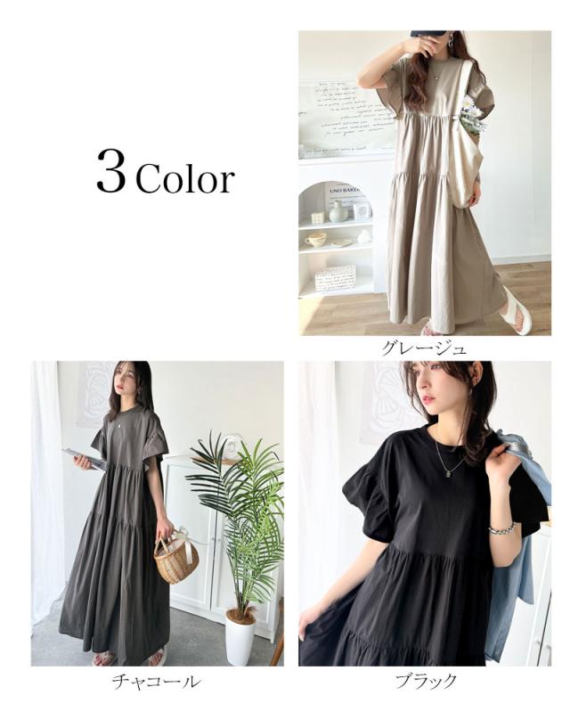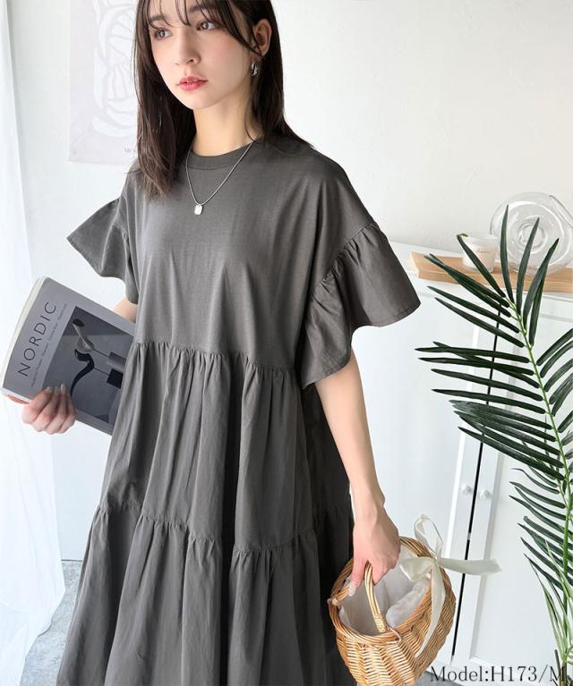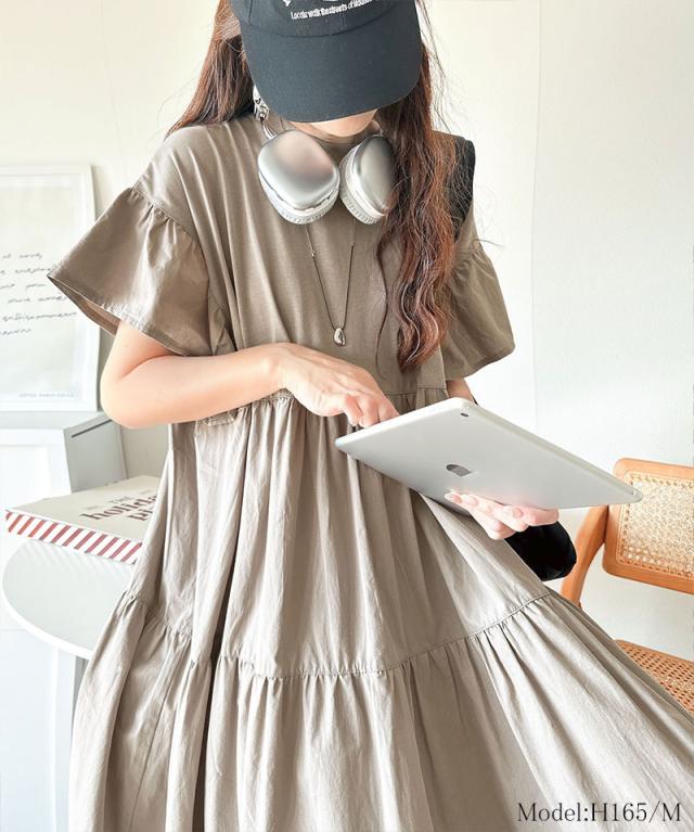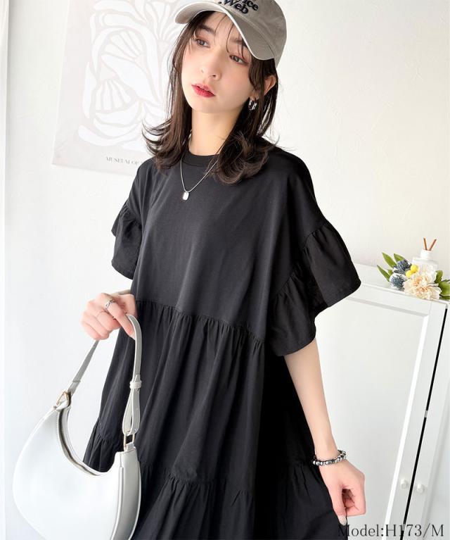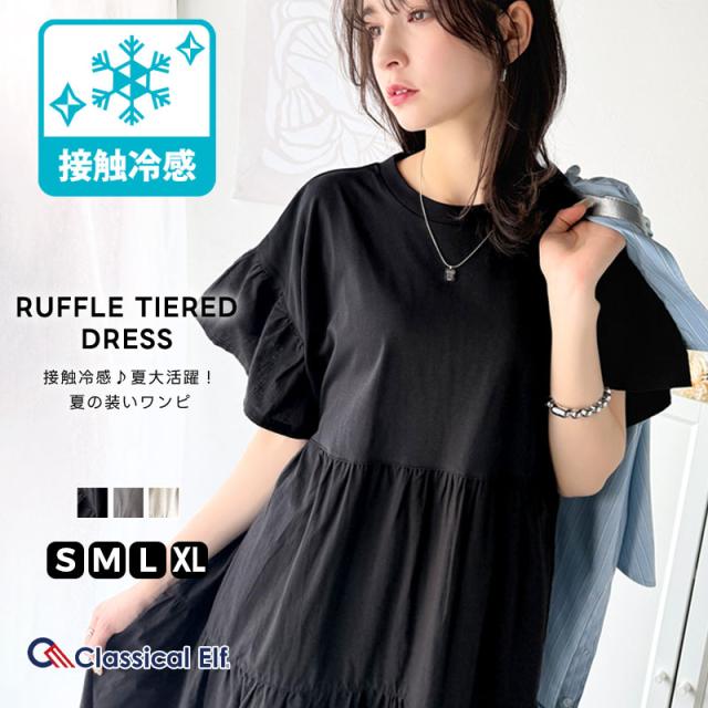 ★接触冷感♪涼しげフリルで夏の装い。布帛ドッキング袖フリルティアードワンピース(ロング丈)★