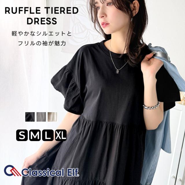 クラシカルエルフ冬新作 ワンピース レディース 接触冷感 布帛 ドッキング 袖 フリル ティアード ワンピ ロング丈 体型カバー ゆるっと オーバーサイズ 大きいサイズ 2025ss ce1050293
