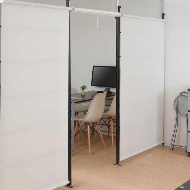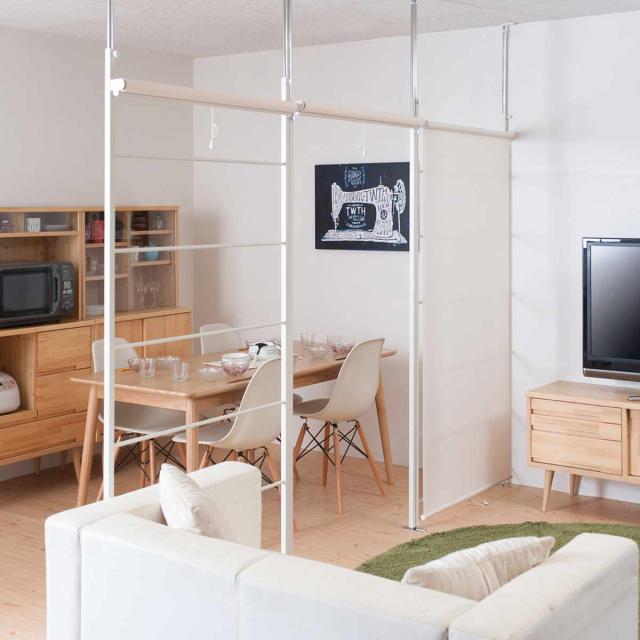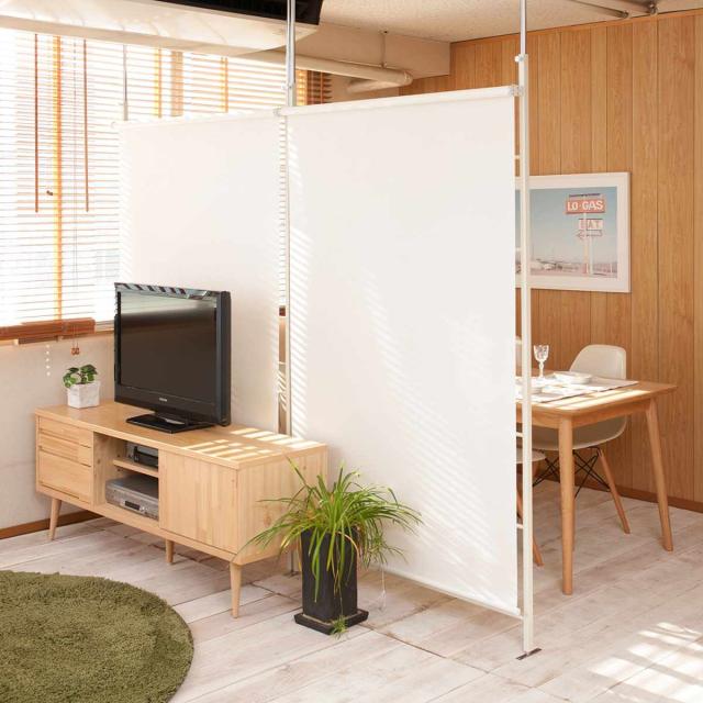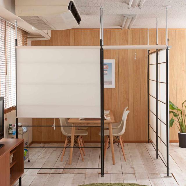 お部屋の仕切りに便利な突っ張り式のパーテーションです。ロールスクリーンが付いているので、スクリーンの開け閉めで、光の取り入れや間仕切り具合を簡単に調整できます。スクリーンを上げればさりげない間仕切りに、スクリーンを下げれば完全間仕切りとしてお使いいただけます。