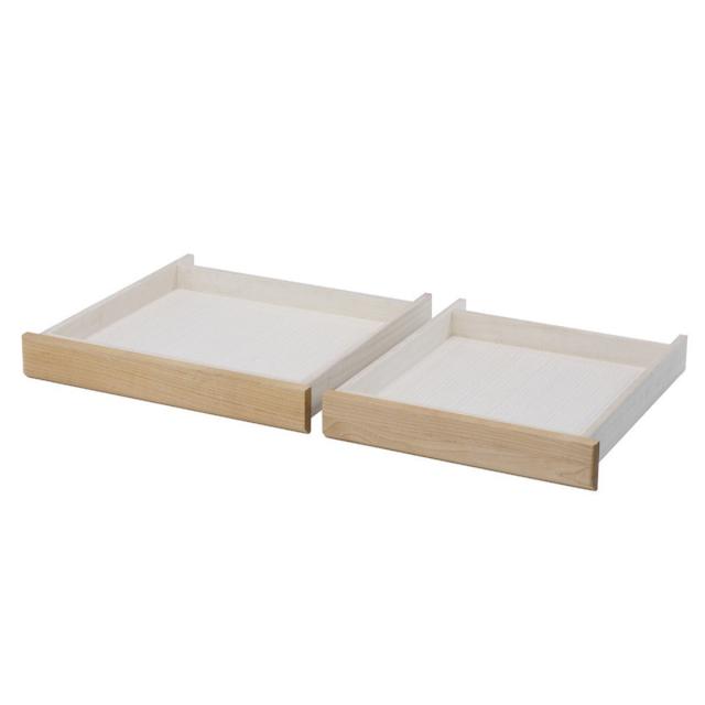 スムーズに開閉ができ、耐久性が高い桐材を使用したレールレスの引き出しが2杯付いています。左側はA3サイズ、右側はB4サイズを収納できます。前倒れや引っ掛かりの少ないロング側板を使い、抜け落ち防止のストッパーも付いています。