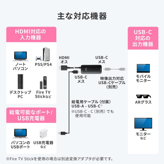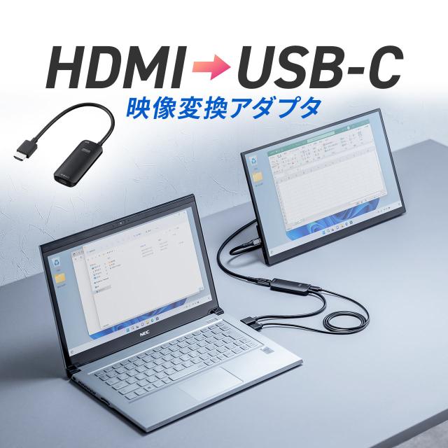 ●HDMIからUSB-Cに変換する映像変換アダプタです。●パソコンのHDMIポートから、USB-C接続のモバイルモニターやARグラスなどに映像出力することができます。