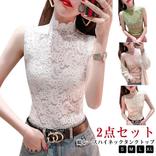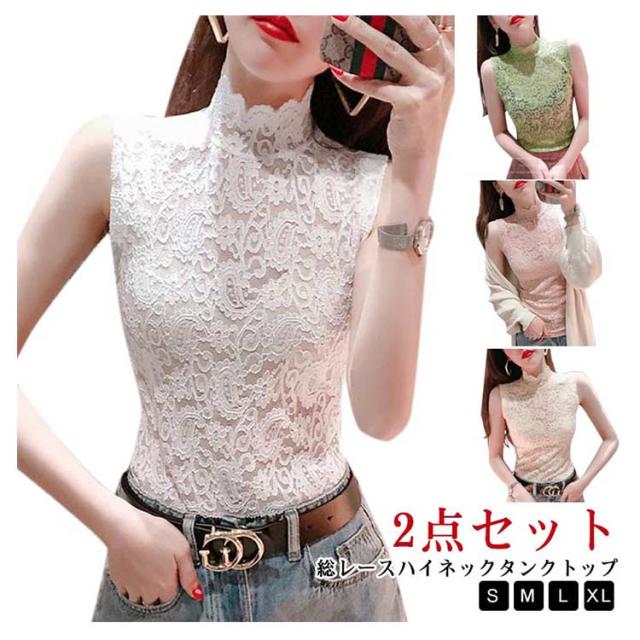 大人可愛い シアートップス ノースリーブ ハイネック レディース 透け感 タンクトップ タンク インナー 2点セット シアー レースタンクトップ きれいめ 下着 春 夏 秋 2点セット トップス 大きいサイズ おしゃれ 母の日 プレゼント フェミニン 【送無】