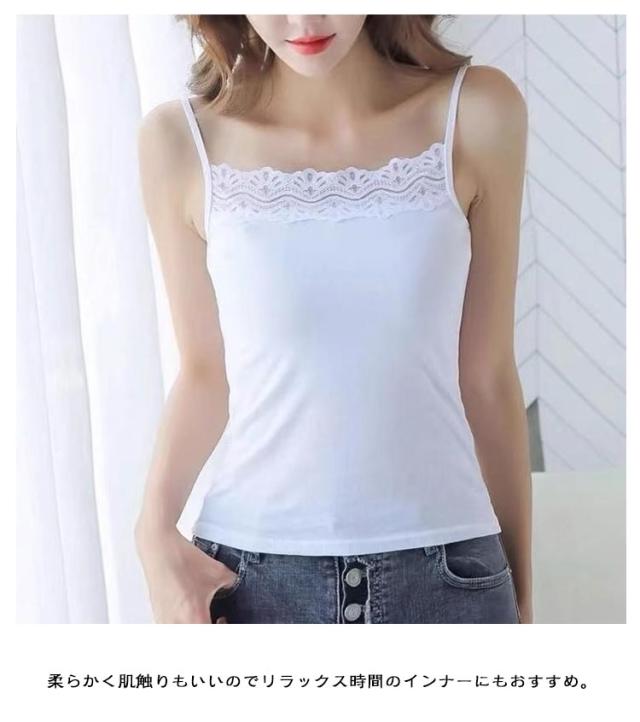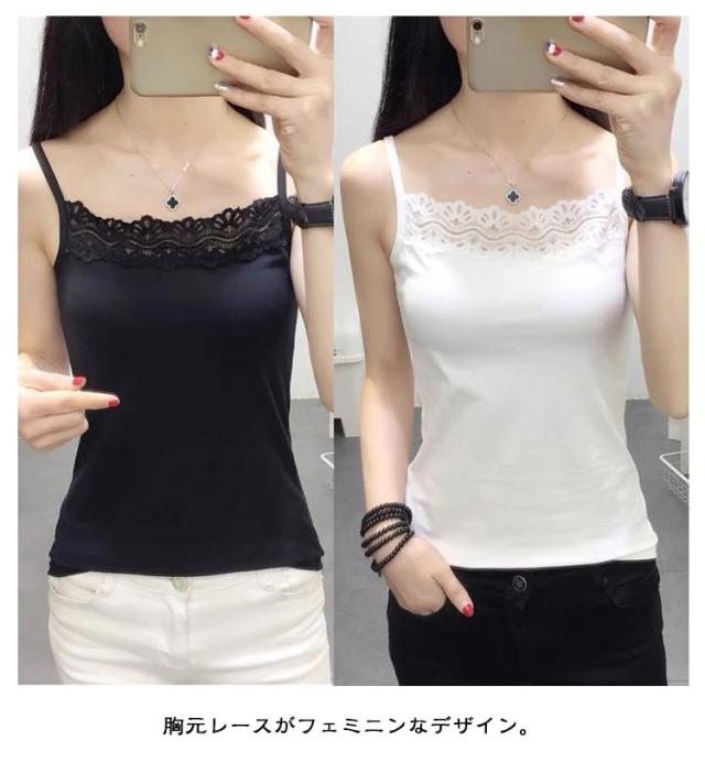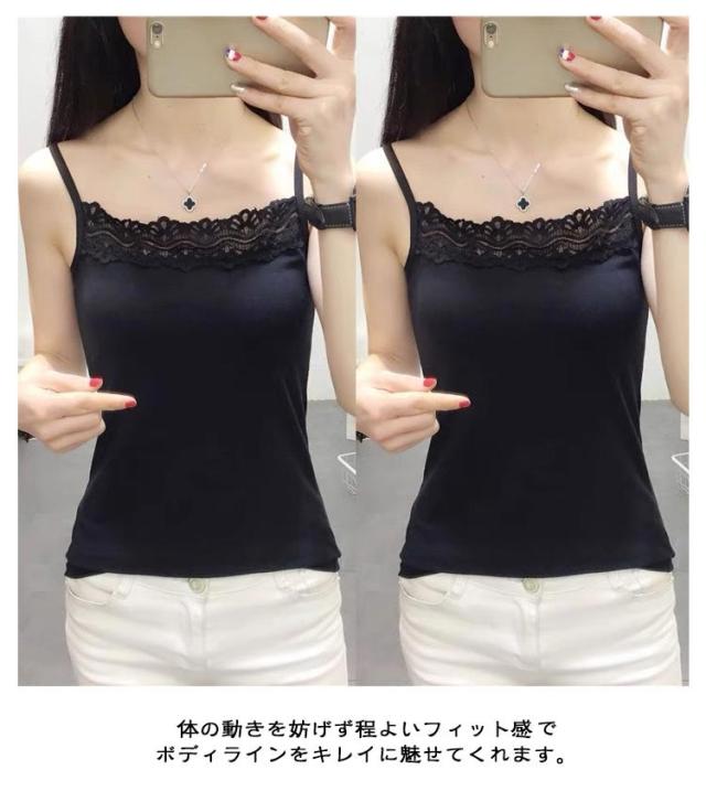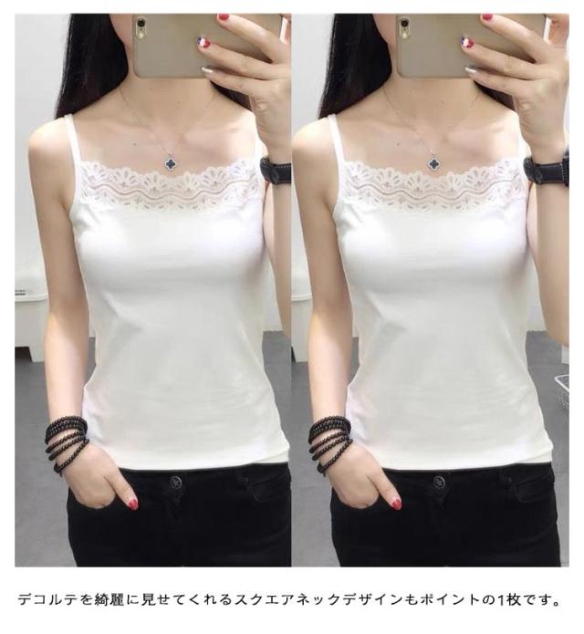 | 胸元レースがフェミニンなデザイン。 体の動きを妨げず程よいフィット感でボディラインをキレイに魅せてくれます。 デコルテを綺麗に見せてくれるスクエアネックデザインもポイントの1枚です。 柔らかく肌触りもいいのでリラックス時間のインナーにもおすすめ。 開きの広いトップスと合わせてレースを見せるのはもちろん、シャツやワンピースのインナーとしても、毎日大活躍。 | |