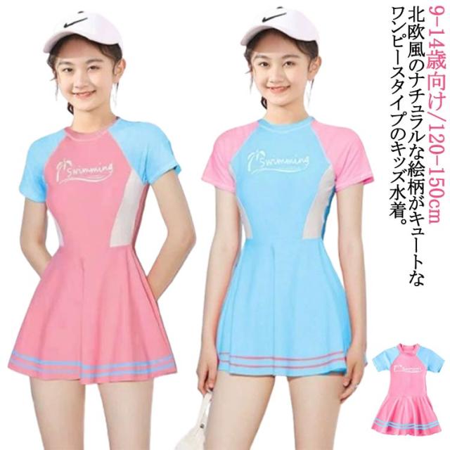 水着 全2色 150 ブルー キッズ 130 140 女の子 ワンピース ワンピース 女の子 半袖 北欧柄 キッズ ピンク 一体型/ボクサータイプ ラッシュガード 120 水着 子供 水泳 スイムウェア 日焼け対策 水遊び キッズ 水遊び 旅行 プール