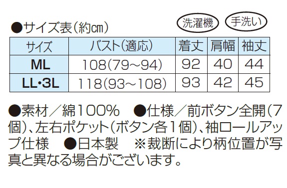 ●仕様/前ボタン全開(7個)、左右ポケット(ボタン各1個)、袖ロールアップ仕様