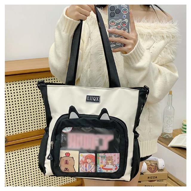 | シンプルでかわいい猫耳の形デザインと使い勝手の良さによって、流行りに学生とか、誰でも適用します。 バッグの前面の透明ポケットで見せたいアイテムで自分の好みにアレンジできるトートバッグです。 好きな芸能人やアニメキャラの写真、缶バッジ、ストラップ、ぬいぐるみ、萌グッズなど入れて一目瞭然です。 | |
