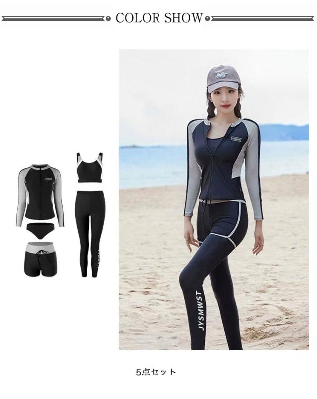| サイズについての説明 | 5点セット(長袖ラッシュガード、ショートパンツ、ショーツ、ブラ一体型トップス、レギンス) |