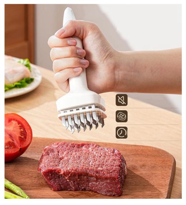 | 均一に分布する24本の鋼針を持ち、肉類を急速に柔らかくすることができる。材質は硬く、耐久性があり、腐食やさびがない。 ブレードの両側は研磨先端処理されており、頻繁に使用しても鋭利さを維持することができます。 肉ハンマーに保護カバーが付いており、自動反発機能付きスプリングを内蔵しており、押圧時にブレードが肉中に膨張し、力がない時に自動的に鋼針を回収し、手を傷つけることなく、騒音や飛散も発生しない。 ちょうど良いカーブを描く滑らかなハンドルは、片手で持ちやすいデザインです。 ハンドルの先には吊り下げ用の穴があり、キッチンフックに掛けられるので場所を取らず、収納も簡単です。 柔らかい肉ハンマーステンレスピンは肉繊維に深く入り込み、結合組織を分解し、効果的に軟化させ、塩漬け調味料や香料をより迅速に吸収させ、各種の肉類をジューシーで、おいしく、よだれを垂らす食事に簡単に転化させる。牛肉、鶏肉、牛肉、豚肉、魚、ステーキ、焼肉、鶏胸肉、豚ロースなどが含まれます。キッチン、ホテル、レストランなどの日常生活にぴったりです。 | |