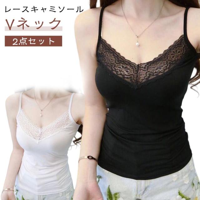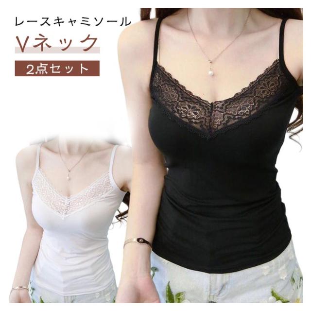 キャミ レディース 夏 胸元レース 春 蒸れない インナー 透けない レースキャミソール 2点セット 大人可愛い きれいめ 通気性 Vネック おしゃれ 下着 2点セット 秋 肌着 レディースインナー レース セット フェミニン 母の日 プレゼント 黒 白