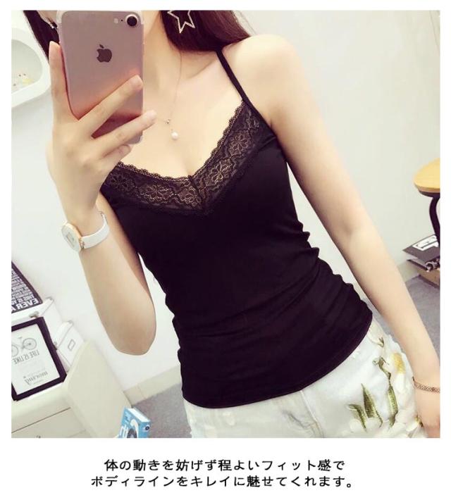 | 胸元レースがフェミニンなデザイン。 体の動きを妨げず程よいフィット感でボディラインをキレイに魅せてくれます。 デコルテを綺麗に見せてくれるVネックデザインもポイントの1枚です。 柔らかく肌触りもいいのでリラックス時間のインナーにもおすすめ。 | |