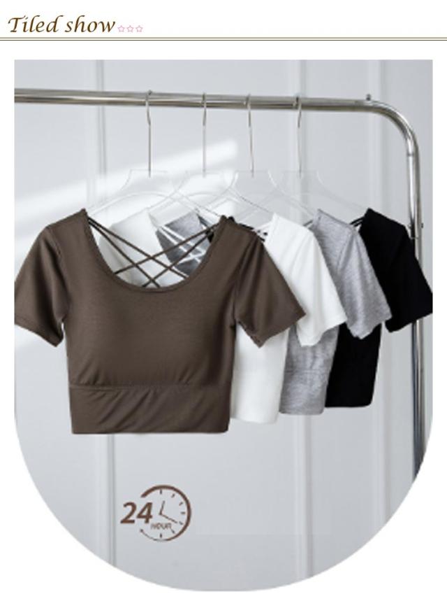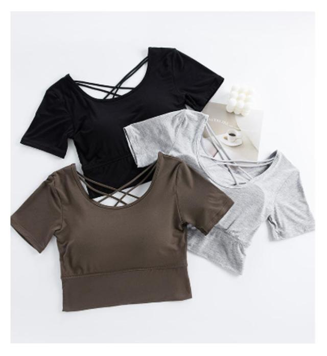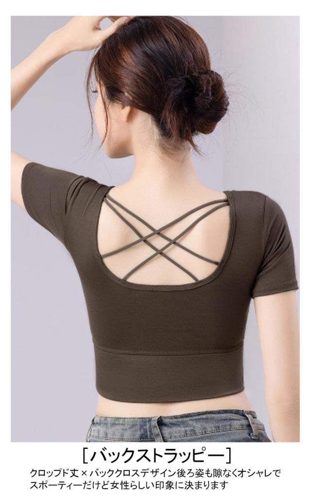 ヨガウェア ウェア トップス フィットネス ショート丈 レディース ピラティス 半袖 ジムウェア カップ付き パッド付き 無地 シンプル スポーツウェア へそ出し ストレッチ ホットヨガ バッククロス ヨガウェア ダンス トレーニング ウェア 伸縮性