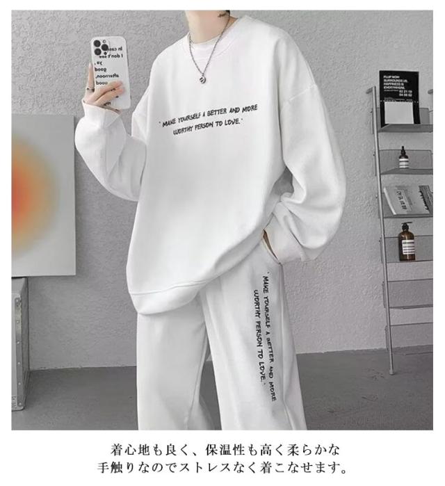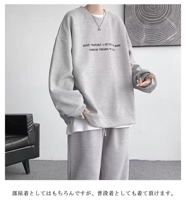 | シンプルな無地のスウェットトレーナーとスウェットパンツのセットアップ。 着心地も良く、保温性も高く柔らかな手触りなのでストレスなく着こなせます。 飽きのこないシンプルなデザインがポイント。 部屋着としてはもちろんですが、普段着としても着て頂けます。 | |