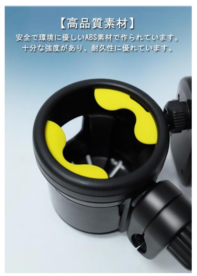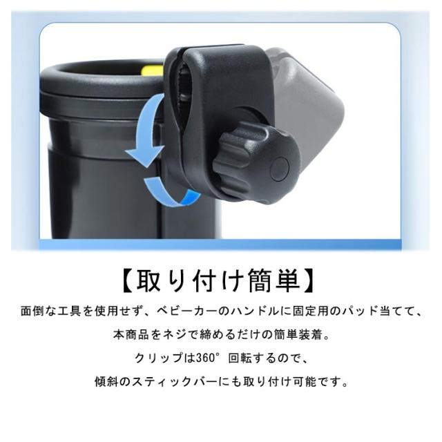 | 【高品質素材】安全で環境に優しいABS素材で作られています。十分な強度があり、耐久性に優れています。 【ツイン仕様】メインホルダー・サブホルダーがあり、使わない時は1つに収納。様々なサイズのドリンクをシリコンストッパーで固定します。 【スマホスタンド付き】スマホスタンドもあり、移動中もスマホを自由に使えます。クリップが360°回転し、縦・横自由に置けます。また、左右にスライドするので、左右どちらの利き腕にも対応します。ワンタッチストレッチで置け、簡単にセッティング出来ます。画面上にもそのまま操作が可能です。強力バネ内蔵で幅5.6~9cmのスマホを挟む事が出来ます。 【取り付け簡単】面倒な工具を使用せず、ベビーカーのハンドルに固定用のパッド当てて、本商品をネジで締めるだけの簡単装着。クリップは360°回転するので、傾斜のスティックバーにも取り付け可能です。 | |
