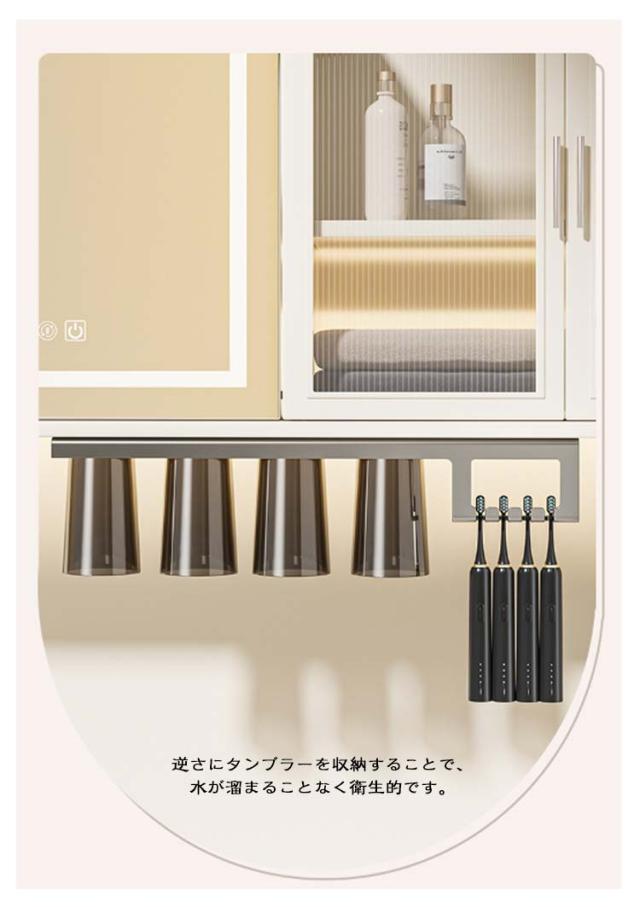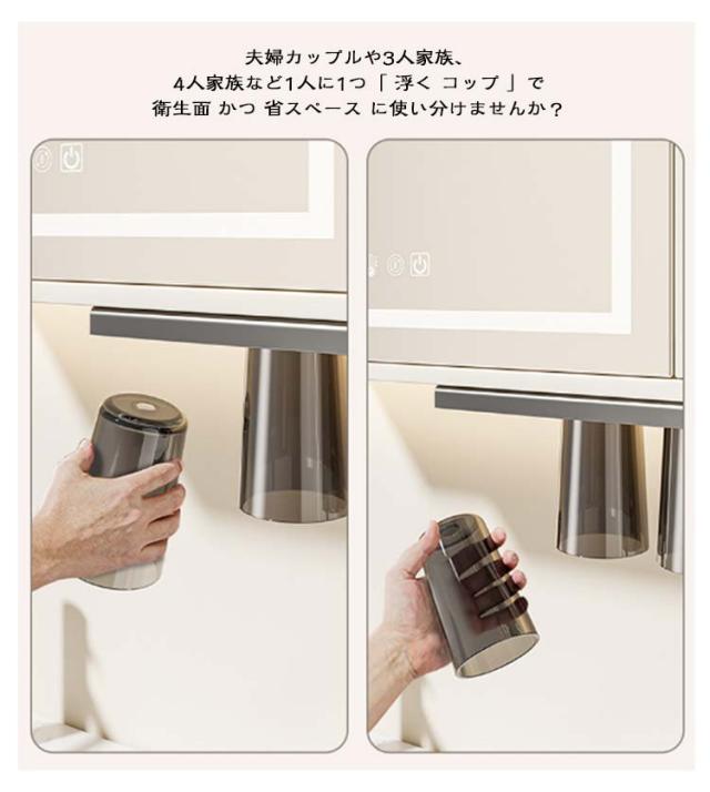 | 浮かせる収納♪スッキリ・衛生的。 コップの置き場のない洗面台でも、吊り下げてスッキリ収納できます。 逆さにタンブラーを収納することで、水が溜まることなく衛生的です。 浮かせて逆さまに収納する事で水切れ が抜群に良くなって水垢 や ヌメリ がつきにくく衛生面も安心。 歯ブラシホルダーも一体型になっているから、普通の歯ブラシや電動歯ブラシなどまとめて収納できます。 夫婦カップルや3人家族、4人家族など1人に1つ「 浮く コップ 」で衛生面 かつ 省スペース に使い分けませんか? | |
