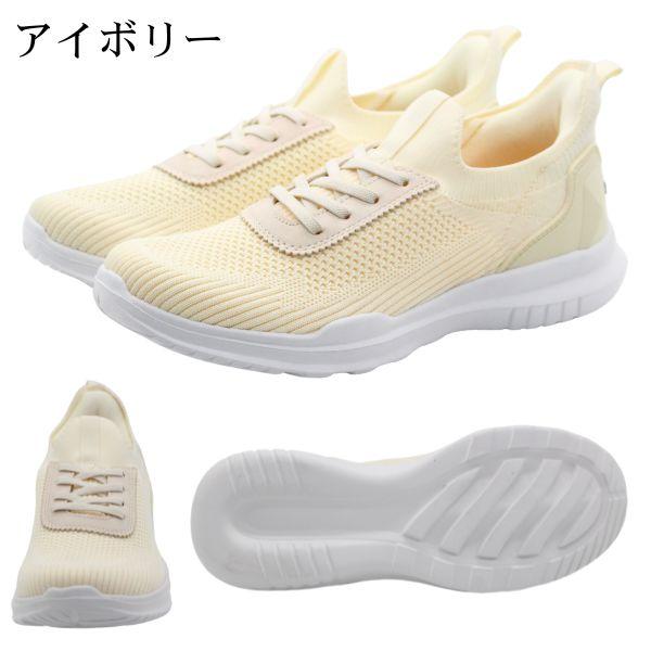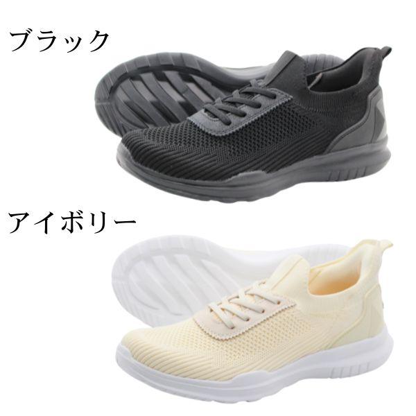 かかと部分の厚手クッションとアッパーのレースアップ風ゴム紐で歩行時の足の動きに優しくフィット、