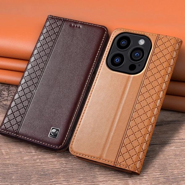 Apple iPhone 14 15 16 16e プロマックスプラスフリップケースグリッドパターン磁気カバー高級牛革本革財布カバー