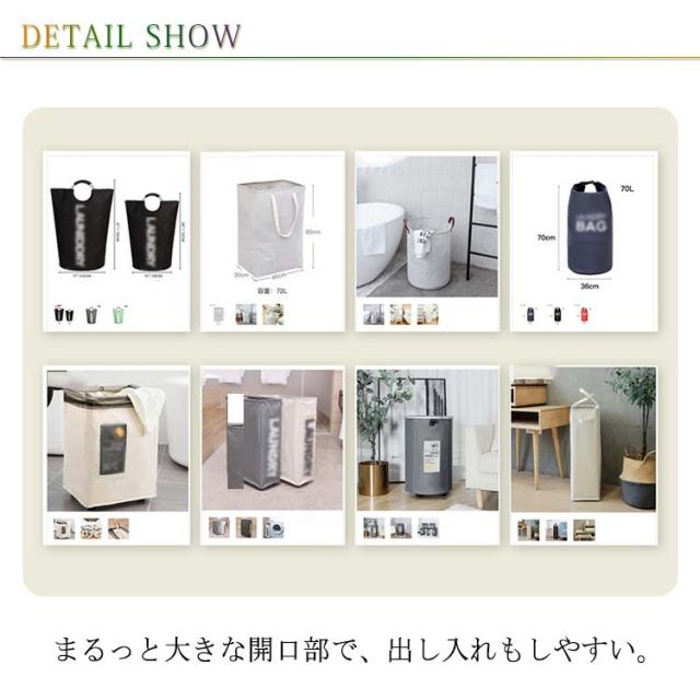 | 80L大容量のランドリーバスケットバッグ。 まるっと大きな開口部で、出し入れもしやすい。 両手で持てるように持ち手がアルミニウム合金製で、持ち運びが便利。 内側には防水シートが施されているので濡れてしまっても安心! 使わないときはコンパクトに折りたたんで隙間に収納できます。 洗濯かごに、おもちゃ箱に、アウトドアに。ぽんぽん入れるだけですっきりシンプルに収納! | |