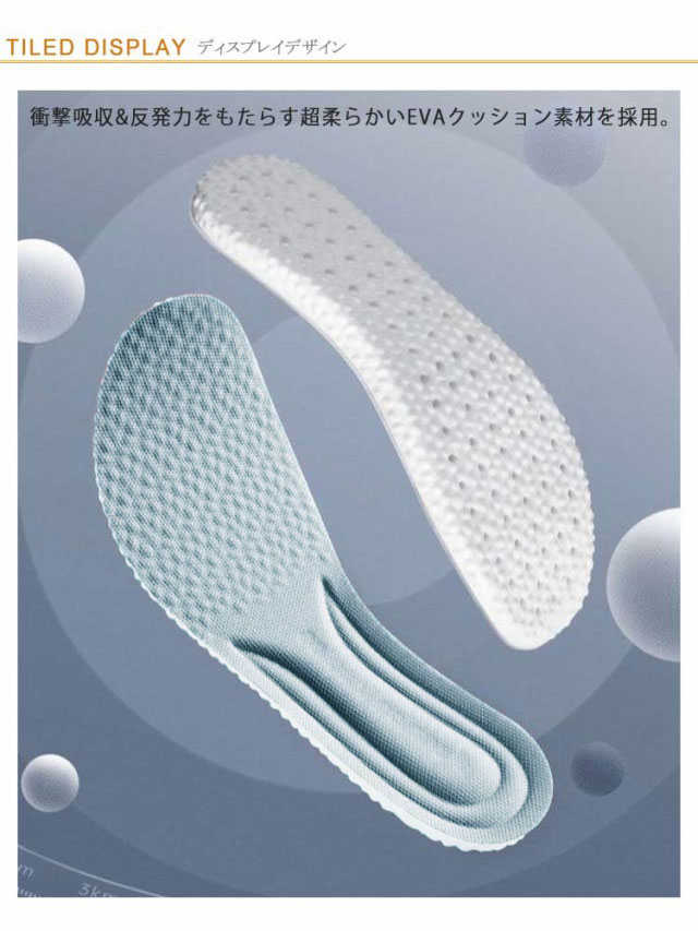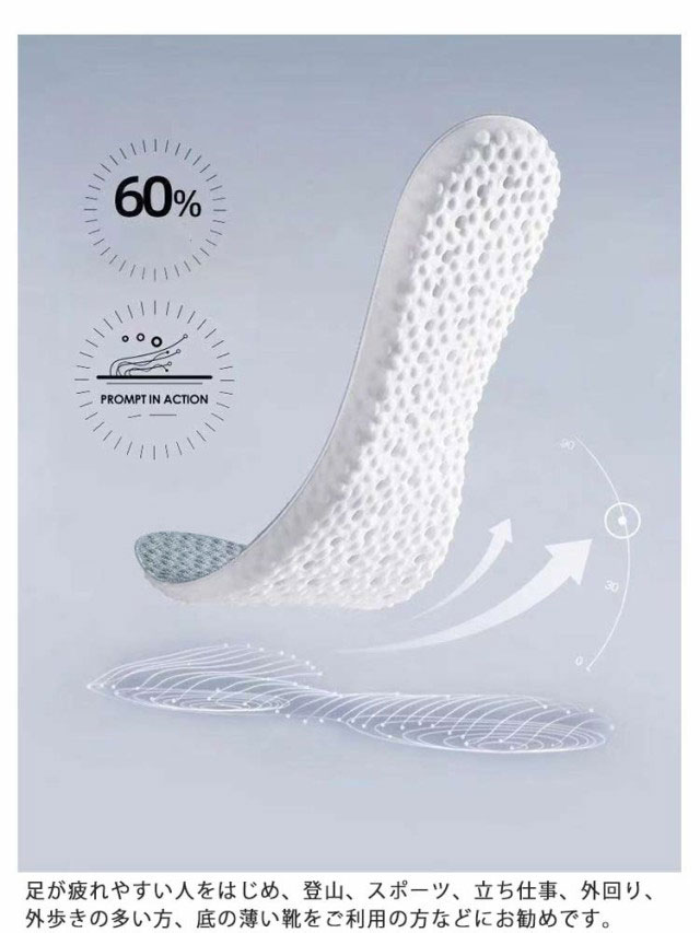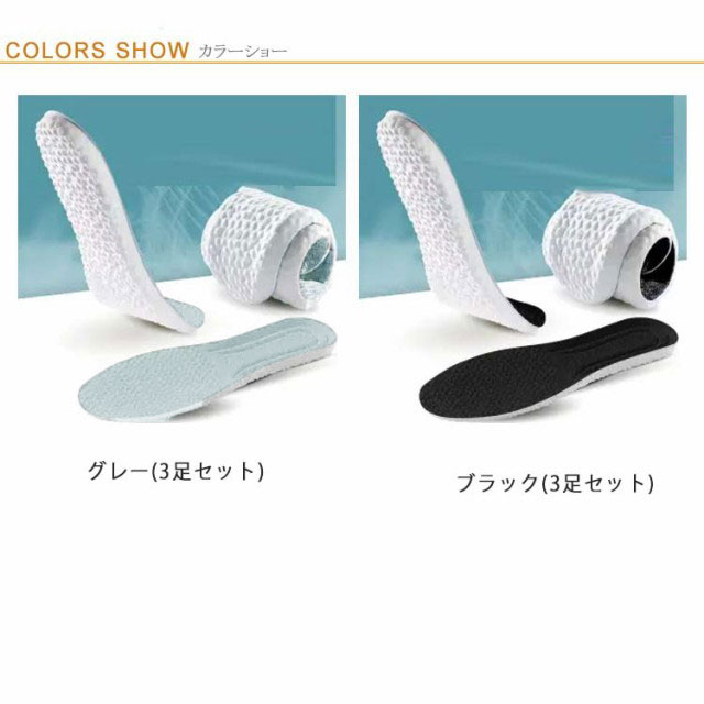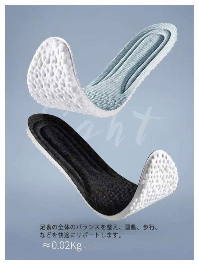| 超柔らかいインソール3足セット。 衝撃吸収&反発力をもたらす超柔らかいEVAクッション素材を採用。 前足部分に通気孔付きで通気性アップ。表地はムレを防ぐメッシュ構造で快適に靴の中を保ちます。 足裏の全体のバランスを整え、運動、歩行、などを快適にサポートします。 ハサミでカットしてサイズ調整をしていただけます。 足が疲れやすい人をはじめ、登山、スポーツ、立ち仕事、外回り、外歩きの多い方、底の薄い靴をご利用の方などにお勧めです。 | |
