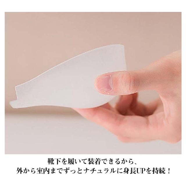 | 靴の中に隠せるシークレットインソール 靴下を履いて装着できるから、外から室内までずっとナチュラルに身長UPを持続! やわらかいシリコン製なので衝撃を吸収してくれるので歩行時の負荷も軽減☆ 水洗いもできるのでいつでも清潔にお使いいただけます。 | |