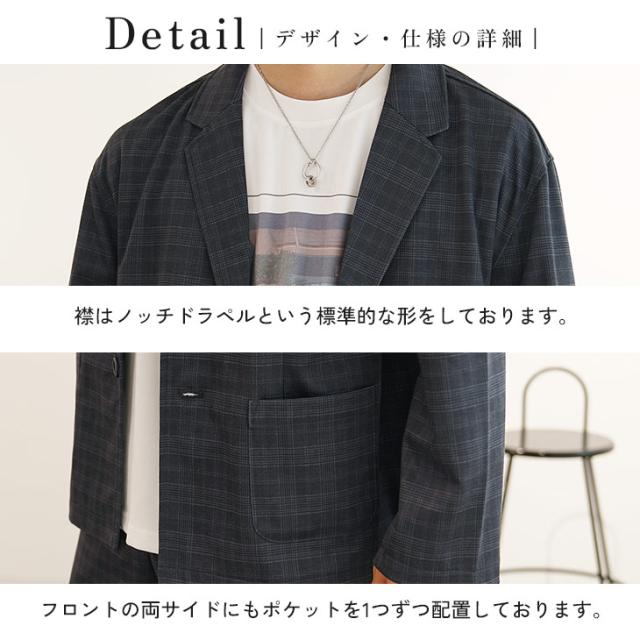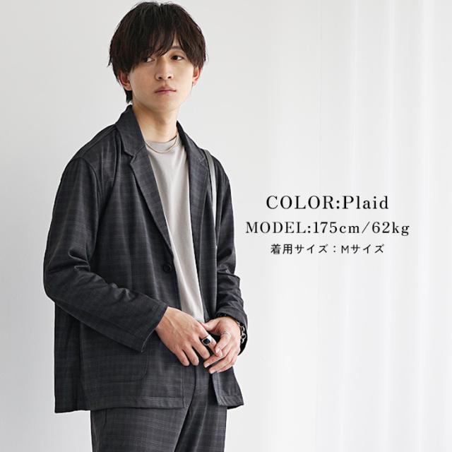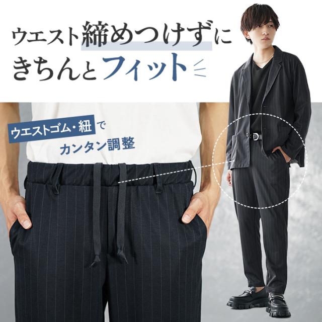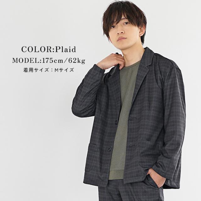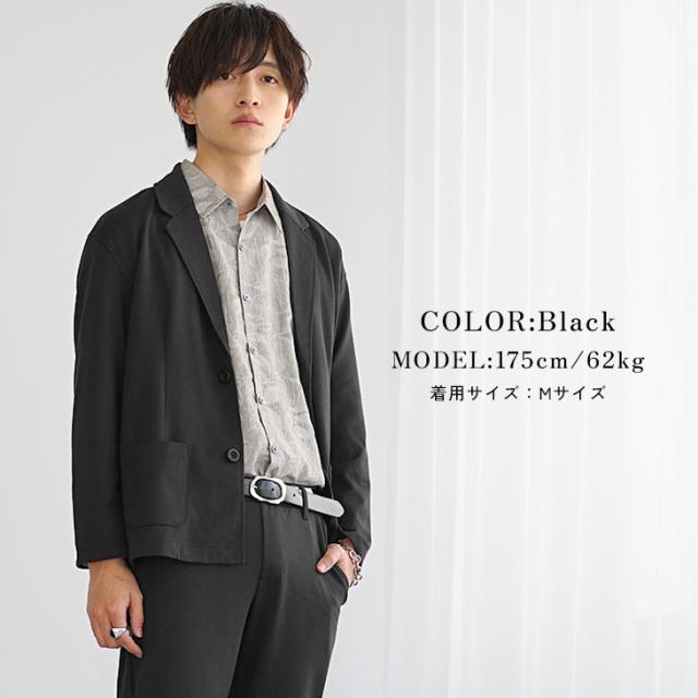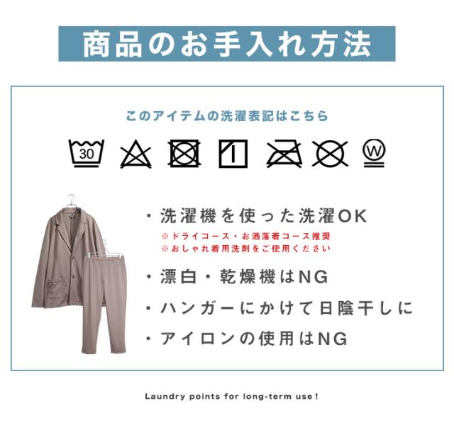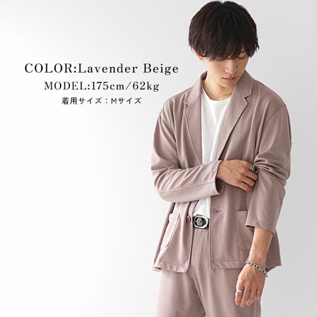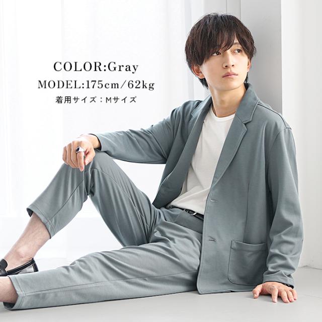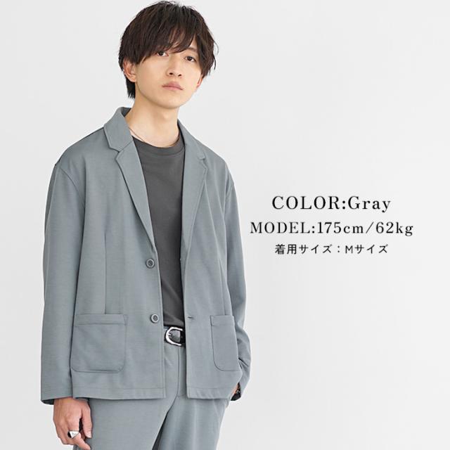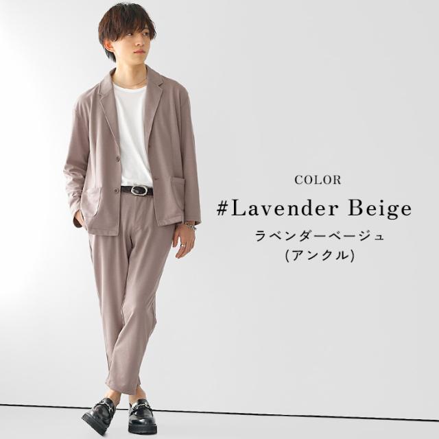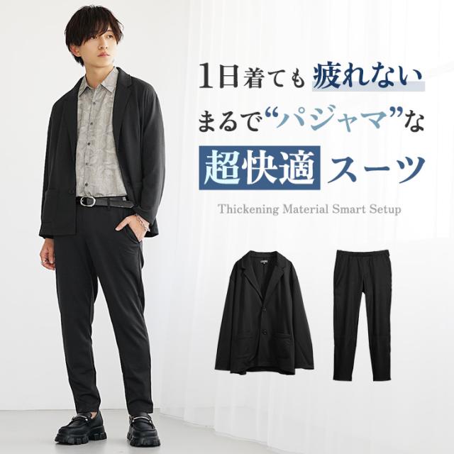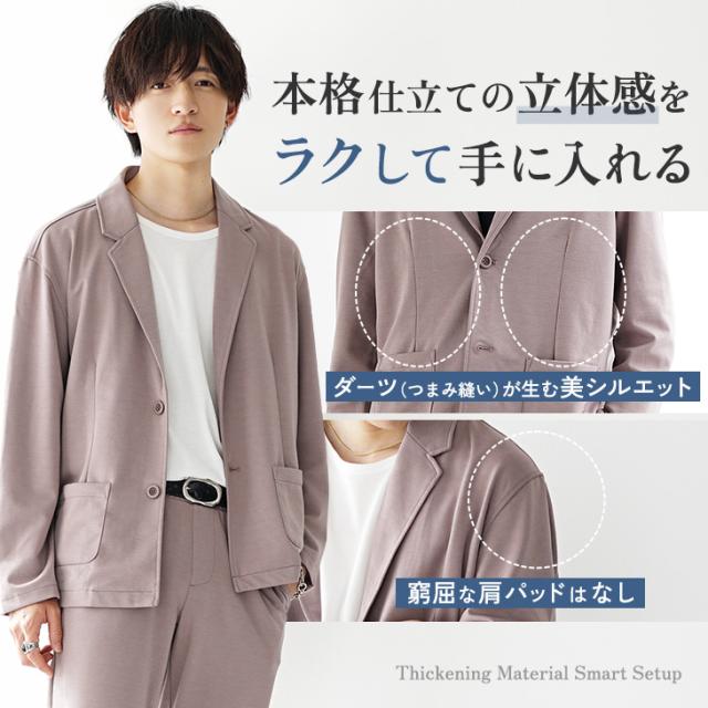 伸縮性抜群のとろみ素材を使用し、1日着ても疲れないパジャマのような着心地のセットアップ。窮屈さを極限まで減らすためジャケットにありがちな肩パッドを無くし、パンツにはウエストゴムを入れることで締め付け感のない仕様に。