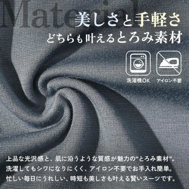 伸縮性抜群のとろみ素材を使用し、1日着ても疲れないパジャマのような着心地のセットアップ。