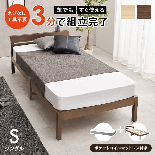 ベッド ベッドフレーム マットレス付き シングル すのこベッド シングルベッド すのこ コンセント付き ボンネルコイル 組み立て簡単 ネジレスライト 簡単組立 工具不要 ベット 新生活 引っ越し 移動 棚