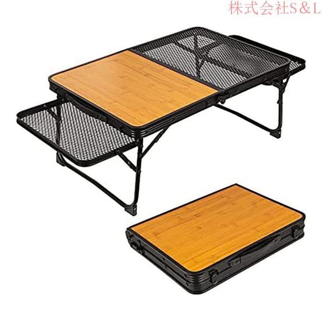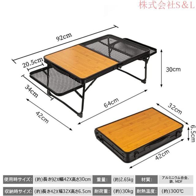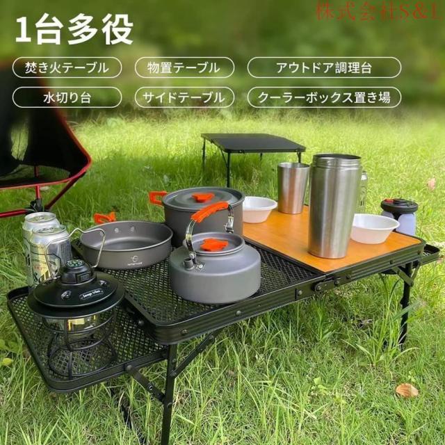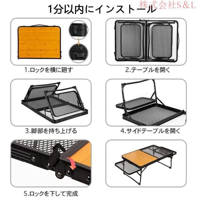 【拡張可能なスペース】キャンプ テーブルの通常のバージョンと比較して、私たちのキャンプ テーブルは、両側に 2 つのメッシュ テーブル パネルを追加して、スペースを増やします。鉄のメッシュと木製のツーインワンデスクトップの助けを借りて、側面に鉄メッシュの平面コンソールを 2 つ追加することも可能です、水筒やフライパンなどの熱いものを置くこともできます。