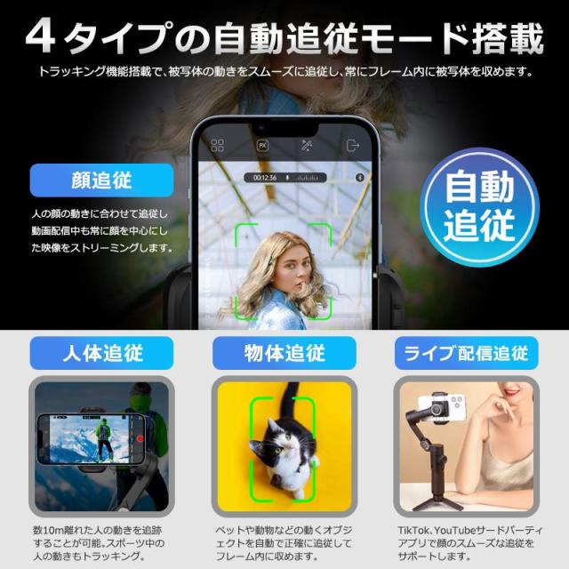 革新的な360°無限回転式インセプションモード、三脚付きのスタビライザー。プロ仕様のジンバルスタビライザーは、より多くの可能性とより大きな視野を与えるために、プロフェッショナルな3軸直交構造で特別に設計されています。各軸の間の広いスペースは極端な角度を容易にし、スマホの画面を遮ることなく映画のようなショットを撮ることができます。スマートトラッキングジンバルとして、各動作を手元に集中させることができます。YoutubeやTiktok、ライブストリーミング、インタラクティブなVlogなどの撮影に最適なジンバルスタビライザーです。専用のアプリをスマホにダウンロードすることで、ジェスチャーコントロール、自動インセプション、タイムラプス、美容レタッチモード、ヒッチコックエフェクト、ドリーズームクリエイティブな写真やセルフィー映像を撮影できます。旅行、Vlog、スマートフォンでの映画制作に最適です。