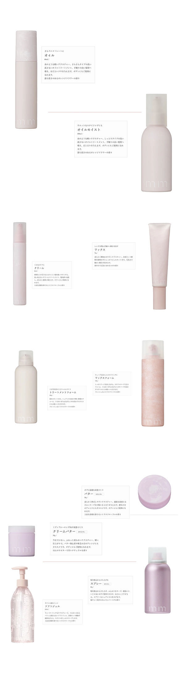 | 商品説明 | 「大人の髪と心をととのえる、ケアスタイリング、 mm(ミリ)。」 忙しい大人の女性たちが、キレイな髪で一日を気分よく過ごせるように。 時々、ちょっと違う自分を楽しんでみたくなるように。 大人のスタイリングを本気で考えました。 “心地よくケア”は当たり前。 mmは、天然由来成分と美容成分のやさしさで、ケアしながらスタイリングできる「ケアスタイリング」をかなえました。 髪をさわりながら、ふわっと広がる香りに、心もととのいます。 ■「mm(ミリ)トリートメントフォーム」の製品特徴 くせ毛を活かしたフォルムづくり。 軽い質感で、軟毛にも使えるくせ毛活かしフォーム。セット力があまりなく、ニュアンスを活かした質感スタイリングを実現。 水分多めで、ドライの髪に使えば寝癖直しにもなり、ちょっと寝坊した朝でもサッと決まります。 フレッシュなシトラスフローラルの香りです。 ■「mm(ミリ)」のトリートメントフォームは 1.コンディショニング成分配合でベタつかない 2.植物由来成分によって、髪をなめらかにする 3.セット力はあえての弱めに設定 という特長があります。 コンディショニング成分を配合することによってトリートメント効果を出し、植物由来のガンマドコサラクトンによって、毛のうねりやからまりを防ぎます。 また、紫外線吸収剤はベタつきの原因になるので、配合する量を減らし、使用感を調整してシルクのような手触りを目指しました。 |