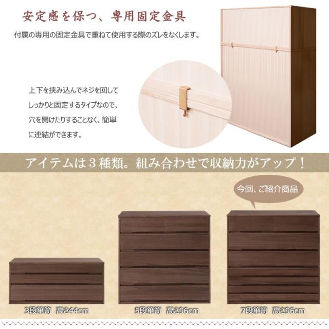 ■商品について/取っ手金物のないシンプルに仕上げたモダンな印象の桐箪笥。洋室などのフローリングにも合うデザインはリビングの中心にもはまる仕上がり。桐材は内部を一定の湿度に保とうとする働きがあるので大事な着物や洋服などを湿気から守る桐箪笥にしまうのがベスト。内部背板には竹炭シートを施しているので、消臭効果もプラス!クローゼットにもおさまるコンパクトサイズからラインナップし、着物や浴衣、洋服など長期保管に最適です。前板を2重に組み上げた箱組仕様で頑丈なつくりはもちろん、その構造だからできる繊細で優雅な取っ手デザイン。経年変化の風合いを楽しめる白木タイプ、ナチュラル・ブラウンの塗装仕上げタイプと3カラーをご用意。買い足し積み重ねて増える着物と洋服をしっかり収納。