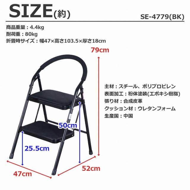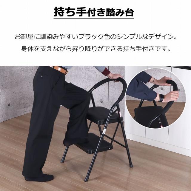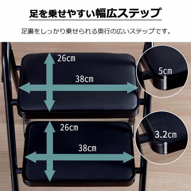 踏み台 2段 折りたたみ 脚立 (約)50幅 完成品 クッション付き 折りたたみステップ おしゃれ ステップ台 折りたたみ椅子 キッチンチェア ステップチェア 滑り止め 幅広ステップ 持ち手つき 軽い コンパクト 持ち運びやすい 掃除 幅47cm 奥行52cm 高さ79cm ブラック 黒