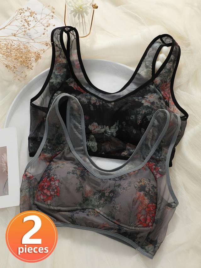 2pcsフラワー柄メッシュブラ、快適な幅広ストラップ、ワイヤレスブラ