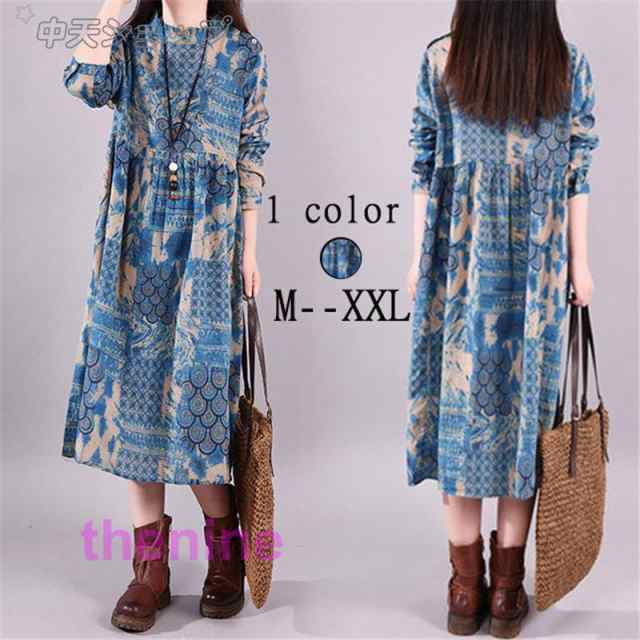 春ワンピース レディース 40代 50代 秋 きれいめ 長袖 ミモレ丈 エスニック風 プリント 綿麻 リネンワンピース夏 チュニック ゆったりワンピース 体型カバー