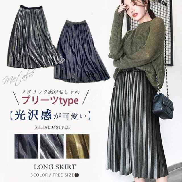 プリーツスカート ラメ 光沢 メタリック シルバー ゴールド ブラック レディース 秋冬 ロング Aライン ウエストゴム 無地 切りっぱなし 体型カバー おしゃれ 20代 30代 40代 大人 スカート 服 新品 新作 秋物 ボトムス ロングスカート 女性用
