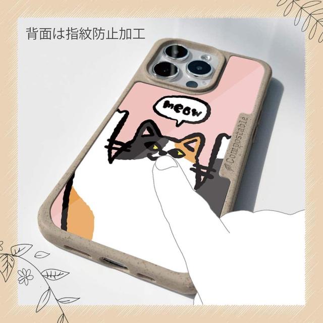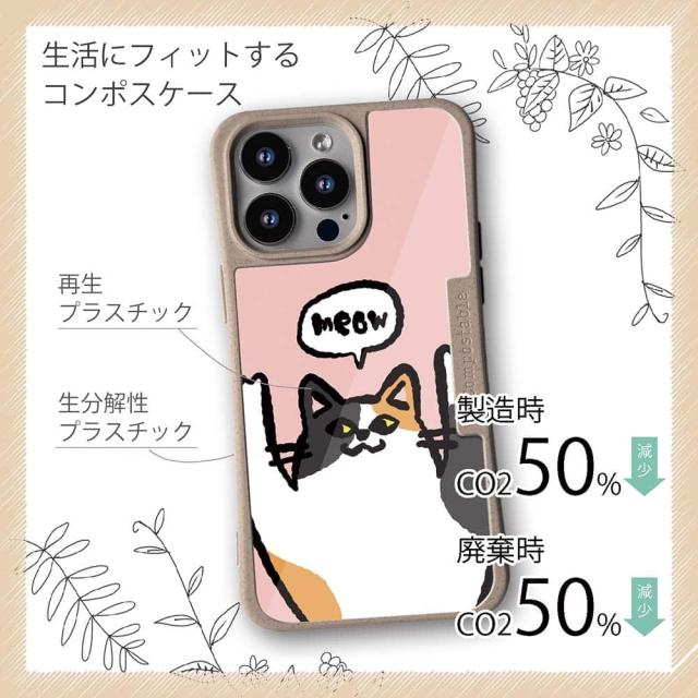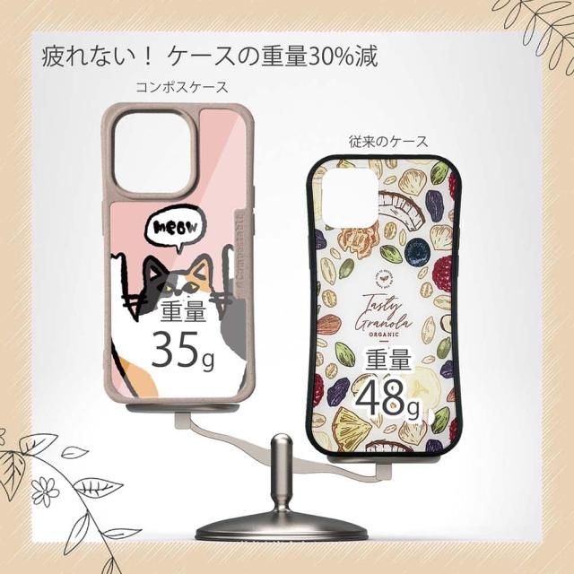 | 注意事項 | コンポスケースは、フレーム部分に「生分解性プラスチック」という環境に優しい素材を使用しております。そのため擦ったり、ぶつけたりする衝撃を与えると脆い部分もあります。耐衝撃ケースではないことをご了承ください。 Qi充電やMagSafe充電にも対応していますが、装着していない時に比べると充電速度は落ちます。 |