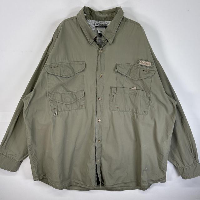 古着 コロンビア Columbia 長袖シャツ PFG フィッシングギア ワンポイント ロゴ XXL カーキ 無地 メンズ