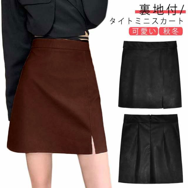 ミニスカート レディース 秋 冬 セクシー 大きいサイズ 黒 おしゃれ 可愛い タイトスカート ハイウエスト 美脚 スリット ストリート ショート丈 ミニ丈 ファスナー Aラインシルエット 裏地付き シンプル 無地 合皮 ツヤあり カジュアル