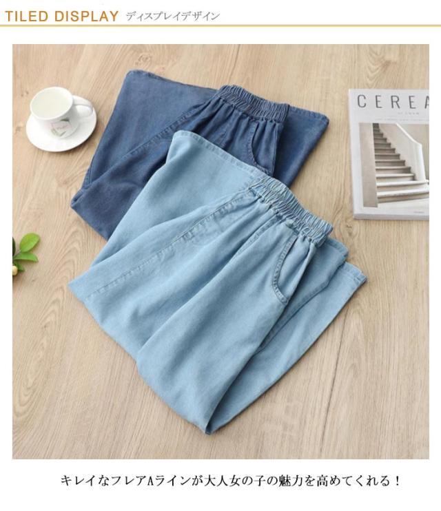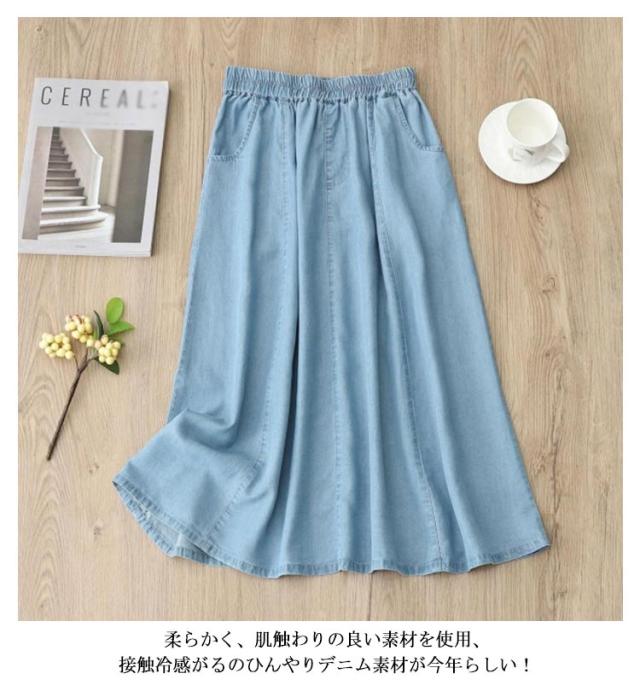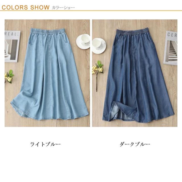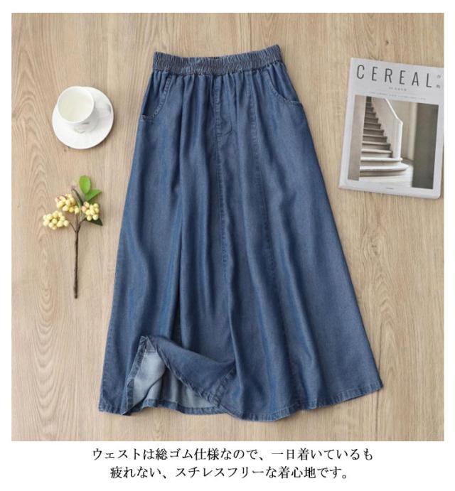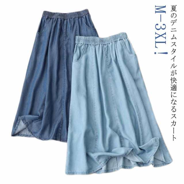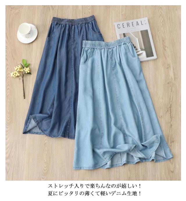 | M-3XL!夏のデニムスタイルが快適になるスカート キレイなフレアAラインが大人女の子の魅力を高めてくれる! ストレッチ入りで楽ちんなのが嬉しい!夏にピッタリの薄くて軽いデニム生地! 柔らかく、肌触わりの良い素材を使用、接触冷感がるのひんやりデニム素材が今年らしい! ウェストは総ゴム仕様なので、一日着いているも疲れない、スチレスフリーな着心地です。 | |