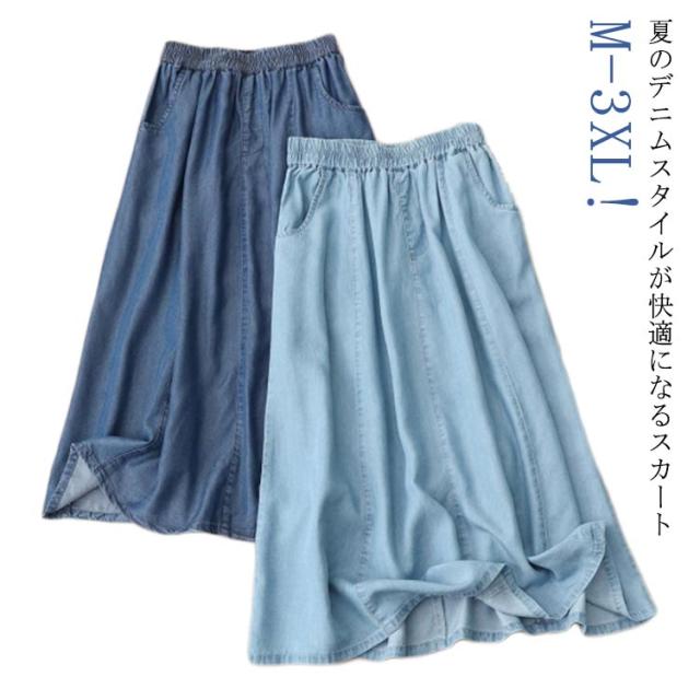 デニムスカート 膝丈 スカート 大きいサイズ ウェストゴム デニム 接触冷感 ロングスカート ストレッチデニム カジュアル 春夏 ひんやり 涼感 膝丈スカート 50代 40代 30代 aラインスカート 夏 ふんわり 体型カバー 美シルエット カジュアル 送料無料