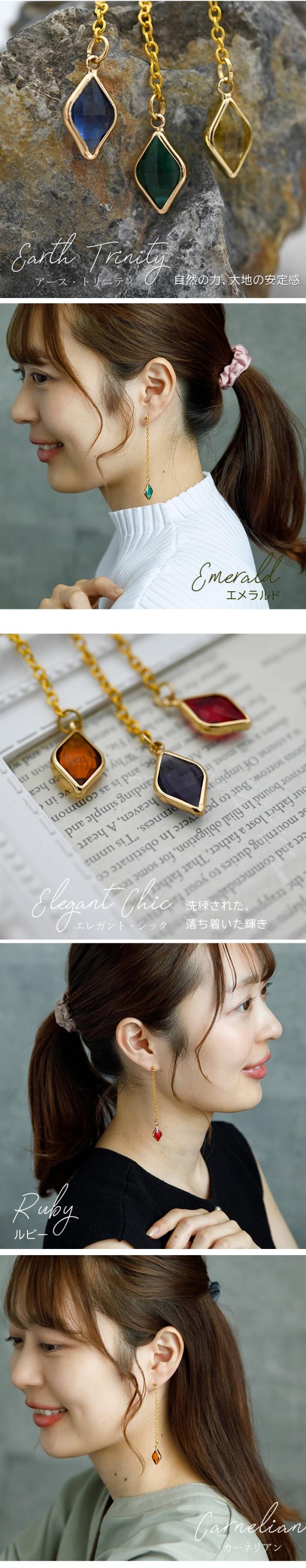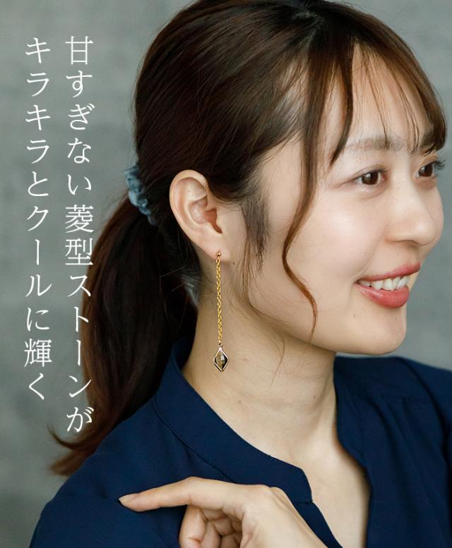 金属アレルギー対応のステンレス製で、肌に優しく安心して使えるのも嬉しいポイント。揺れるゴールドのチェーンと、丈夫で軽くシャープなひし形モチーフが、大人の女性らしい洗練された印象を演出します。