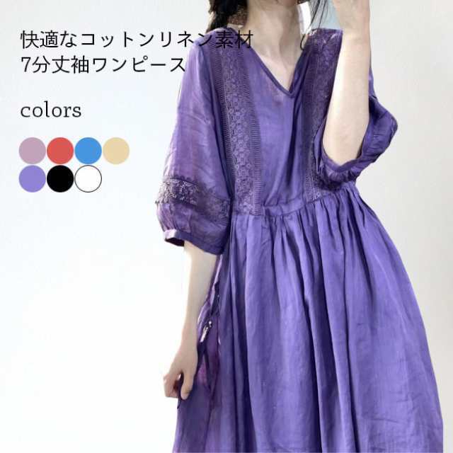 リネンワンピース ロング レディース Aラインワンピース ウエスト調節可 体型カバー 7分丈袖 ワンピース レース Vネック レトロ マキシ丈ワンピース リゾート 普段着 おしゃれ 7分丈袖ワンピース