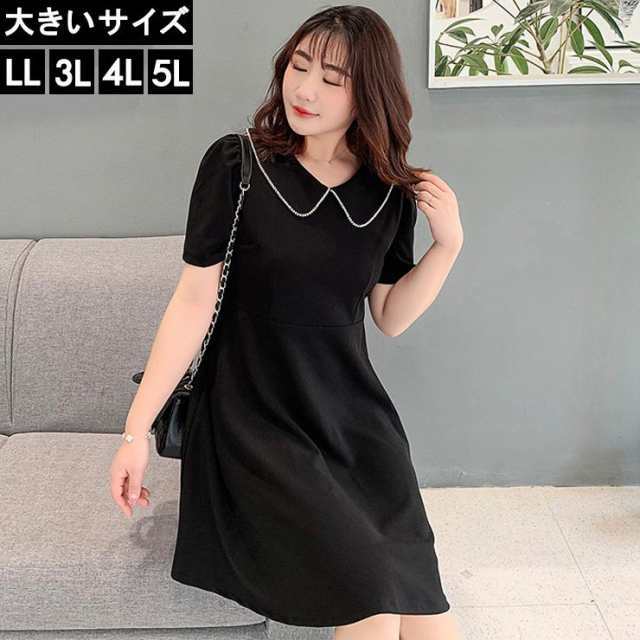 大きいサイズ レディース 襟付きワンピース ウエスト切り替え 半袖ワンピ ビジュー LL 3L 4L 5L ブラック 新入荷 ネコポス不可