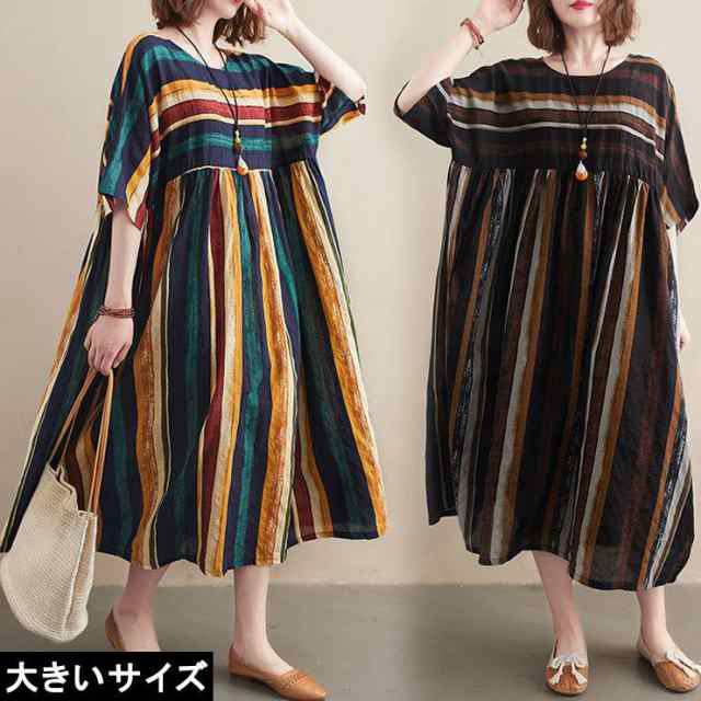 ★☆大きいサイズ レディース ストライプ柄ワンピース 配色 マルチカラー オーバーサイズ LL 3L 4L 5L 6L グリーン系 ブラウン系 10代 20代 30代 40代 13号 15号 17号 19号 21号 新入荷 ネコポス可☆★