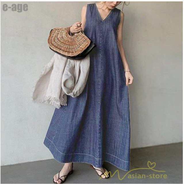 ワンピース ノースリーブ デニムワンピース ロングワンピース マキシ丈 Vネック Aラインワンピース 無地 大人 30代40代50代 ゆったり 広