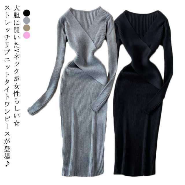 タイトニットワンピース タイトニット タイトワンピース ロングニットワンピース Vネック 長袖 リブ ニットワンピース ロング丈 タイト