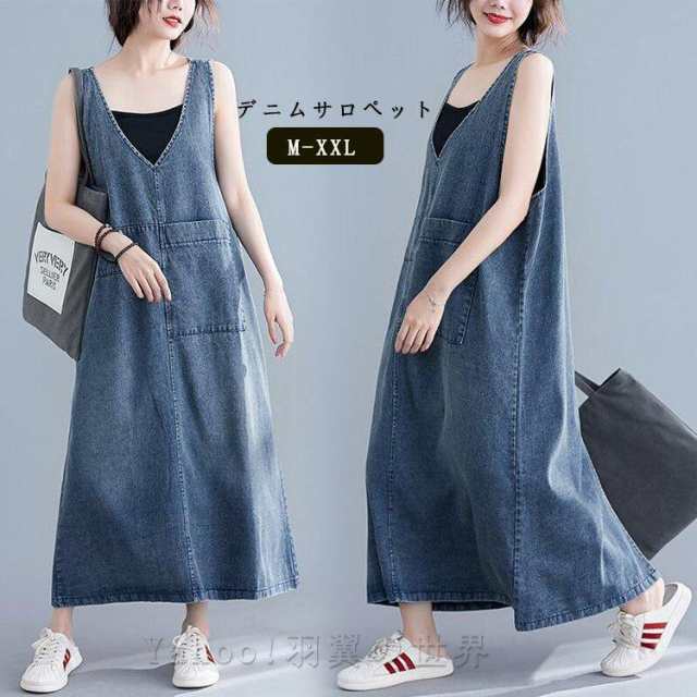 デニムサロペットスカートレディース体型カバージャンパースカートデニムワンピースロングワンピースマキシ丈ロング丈オールインワン40代