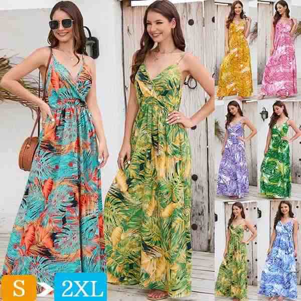 ハワイ リゾートワンピース マキシ丈 Vネック ノースリーブ 花柄 総柄 背中開き Aライン 体型カバー 夏ワンピ ロングワンピース 沖縄 海外旅行 黄 緑 ピンク 紫 青 レディース マキシワンピース ウエストゴム おしゃれ 大人可愛い 細見え dm162t2t2x0